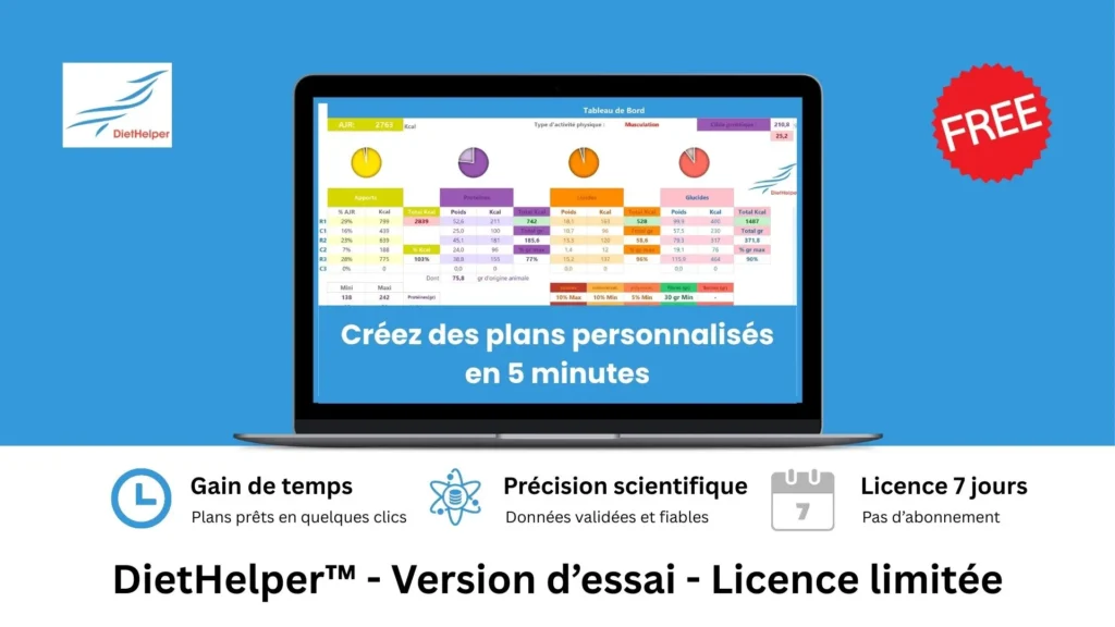 DietHelper est un logiciel de nutrition pour coachs sportifs conçu pour simplifier la création de plans alimentaires, sans abonnement ni formation en diététique.