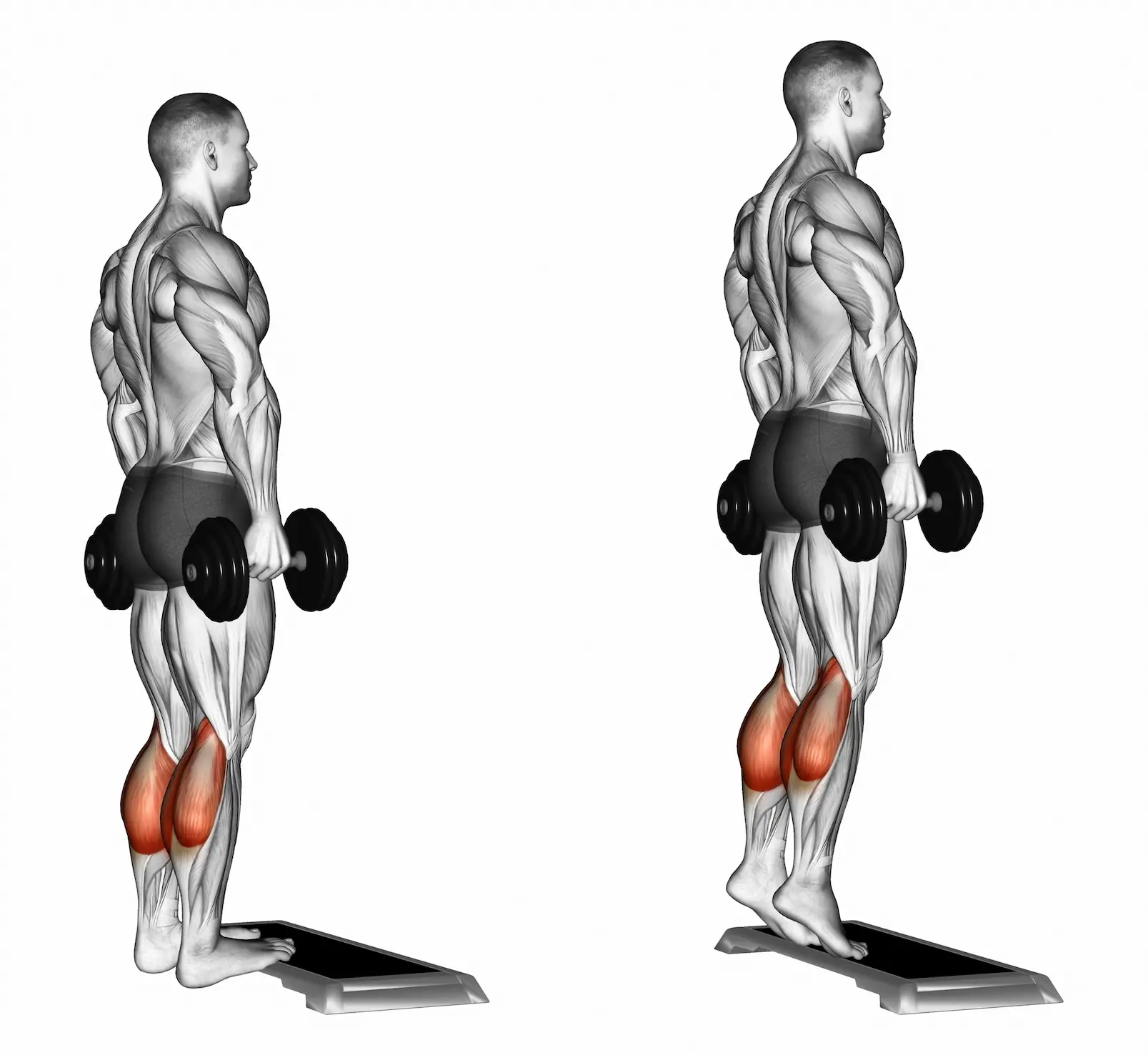 Tiens un haltère dans chaque main, bras le long du corps. Place l’avant des pieds sur une marche ou un step, talons dans le vide. Pieds parallèles, largeur bassin. Gaine les abdos, garde le buste droit et inspire avant de démarrer. - Phase concentrique (montée) :