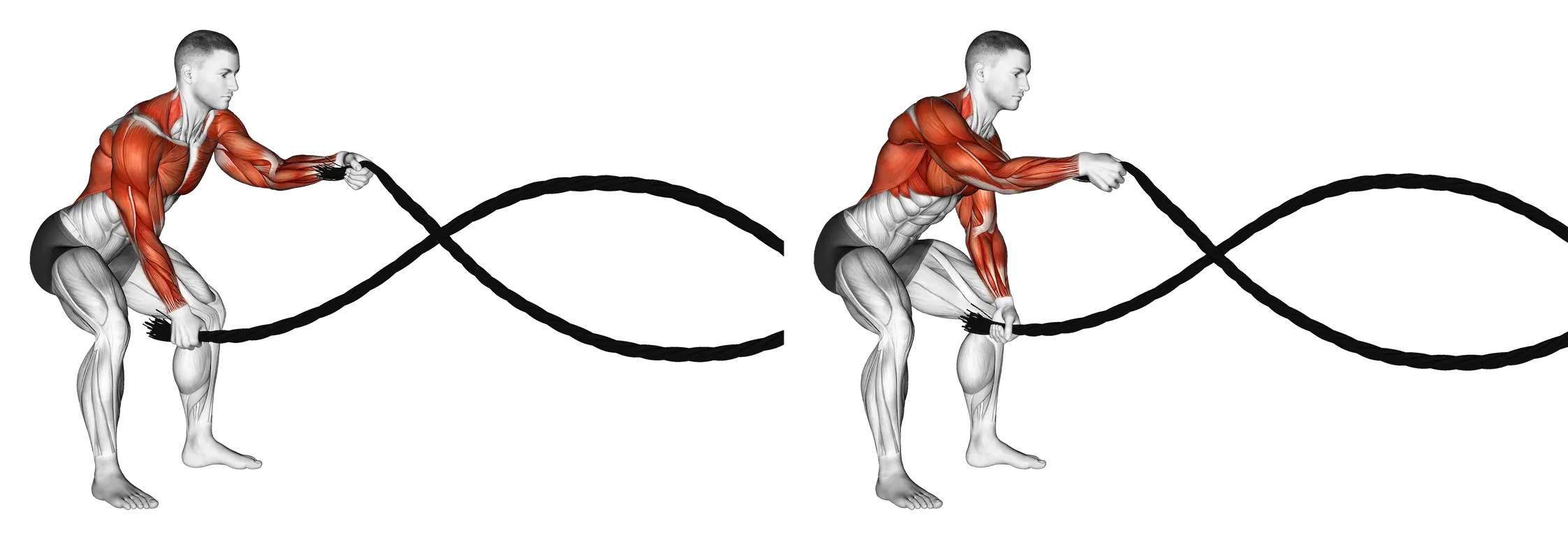 Alterne la montée et la descente des bras de façon rythmée pour créer des ondulations nettes dans les cordes. Le tronc reste fixe et gainé, les jambes amortissent légèrement le mouvement, sans rebondir exagérément.